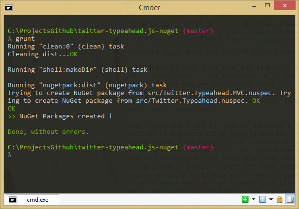 Now, there are many ways to automate a Nuget pack and publish. Traditionally, I've done most of my automation with my C# projects using MSBuild and the Nuget.exe against a .csproj file. Use that method in combination with a build server like TeamCity or TFS, and you have a very nice reliable way of automating your package builds in your own CI environment. My goals, in this case, however, are a bit different. I wanted something portable and could run on the command line cross-platform, preferably without any external dependencies. Grunt, a hugely popular JavaScript task automation library, fits that bill perfectly. It's used in many popular open-source projects on Github and is quite helpful for any tasks that can benefit from cross-platform automation. It also has a very active community of plugin contributors to extend the system beyond its base capabilities. For the most part, for any task you can build in JS and run in Node, you can automate with Grunt.