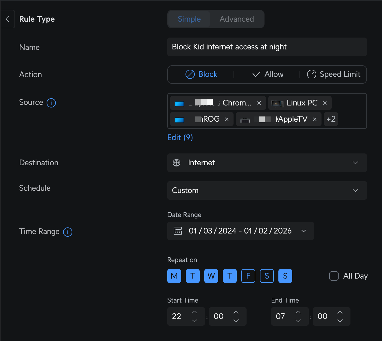 Let's create a rule or two. Navigate to Unif Network -> Settings -> Security -> Traffic & Firewall, where there are two tabs: Simple and Advanced. Simple is synonymous with Traffic rules, and Advanced is synonymous with Firewall rules. Though they are different and offer different features in the user interface, they are both essentially firewall rules. The difference is important, though, as Unifi stores them differently, which will matter when it's time to integrate with HA. From what I can gather, a traffic rule is essentially a feature-wrapped firewall rule that allows you to do additional things, like set a schedule and target specific devices without setting up Profile groups or other more advanced ways of identifying devices on the network. It's more or less a user-friendly way to set up a rather complicated thing, which is basically why you might want to use Unifi over something like pfsense, for example.