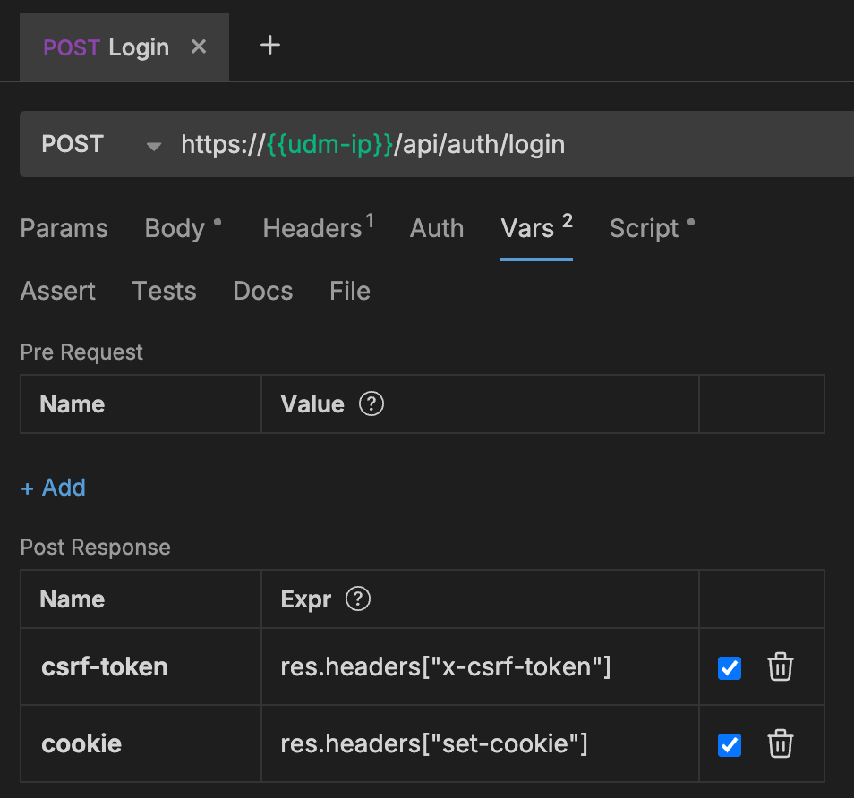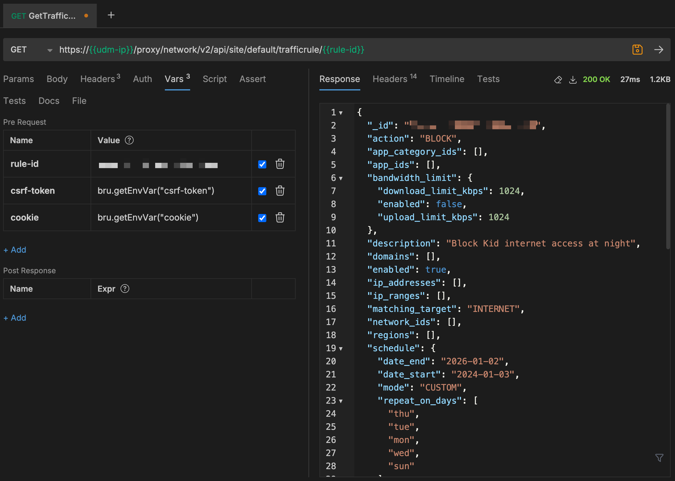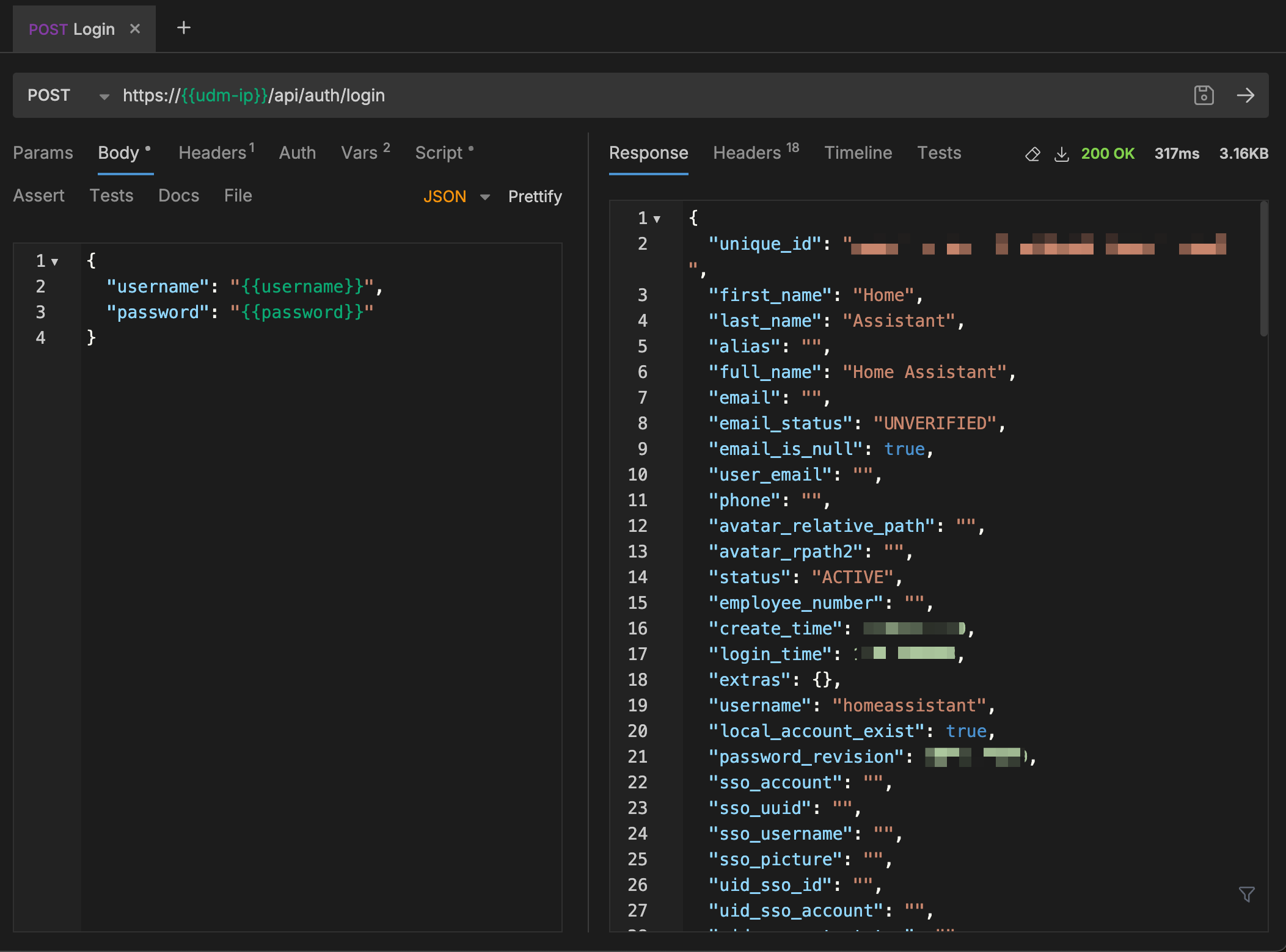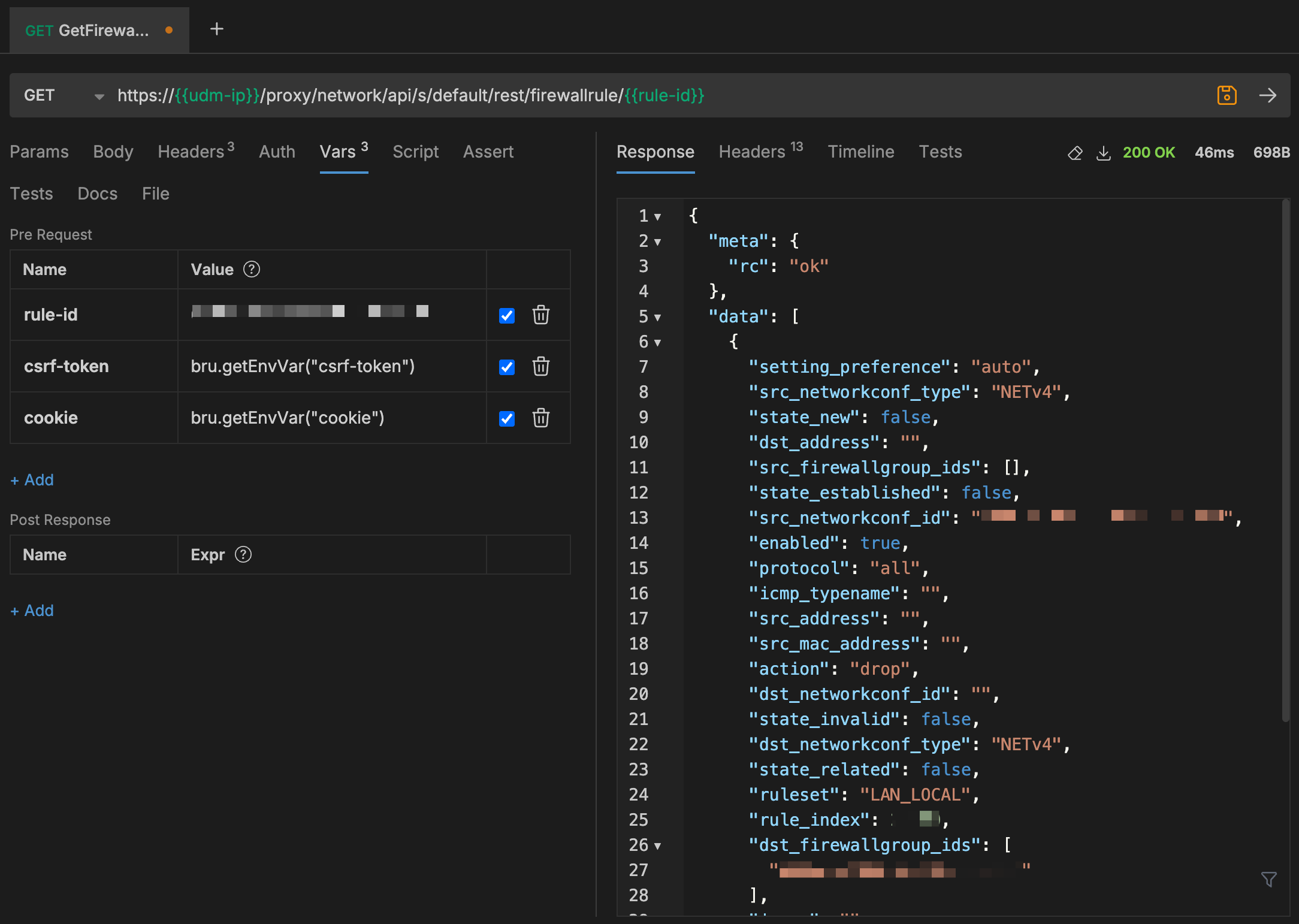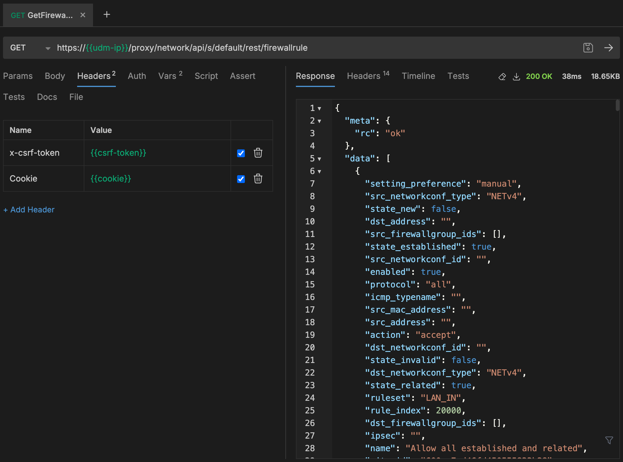 First, I send a POST with my username and password in the JSON body, then I grab the cookie and the csrf-token and set them to environment variables, which I can use in subsequent requests. You'll also receive a full json payload with your user information, roles, groups, etc. Using a Local Admin account is necessary to get the required permissions to manage firewall rules. You can see here that I'm using the local account homeassistant.