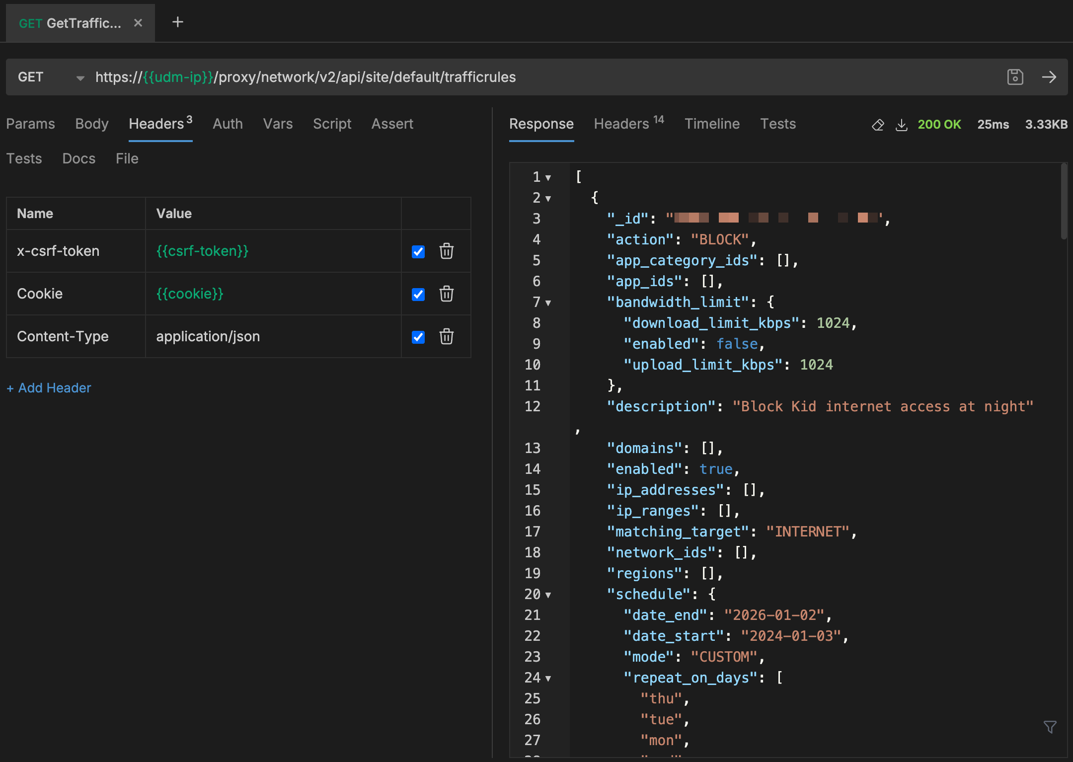 This was a little harder to discover, but with some investigation using the browser development tools and the help of Claude, I found that we need two endpoints. One to pull the list of Firewall (advanced) rules, and one to get the list of Traffic (simple) rules. Here, I'm sending two separate GET requests, first pulling the csrf-token and cookie from the environment (saved from the login request) and then passing in the header. You'll receive a JSON array with each rule and its associated details.