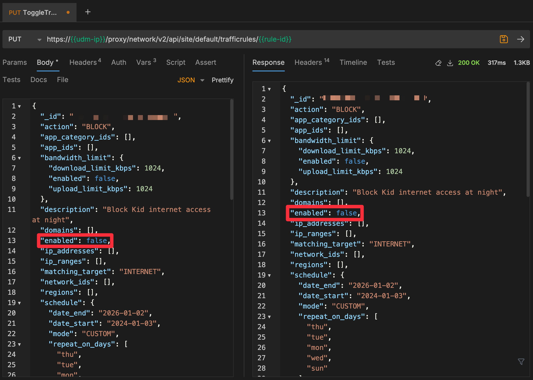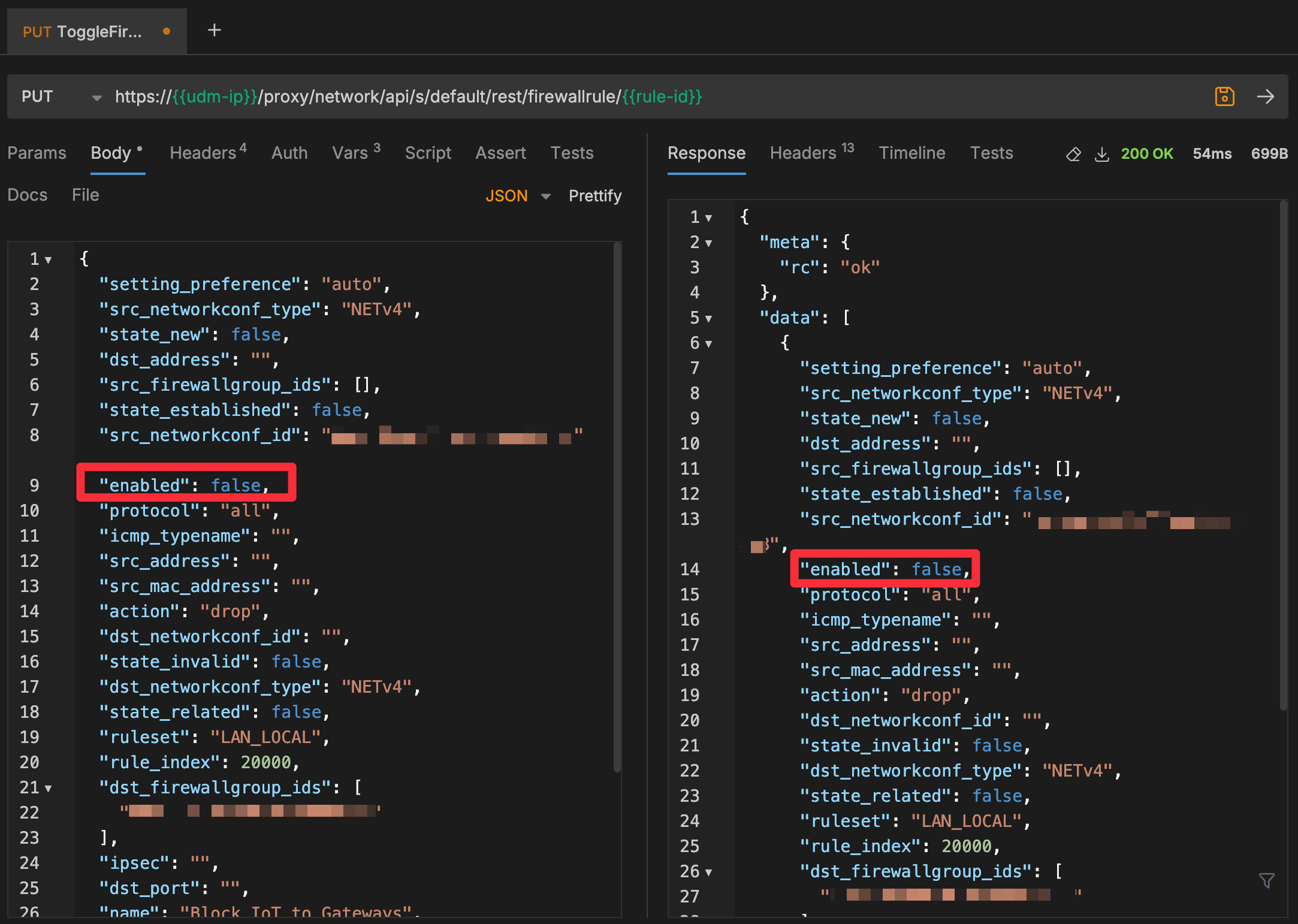 This one was even more challenging to discover and to get working correctly. To toggle the enabled flag on a Traffic or Firewall rule, we need to send back the entire rule, similar to what a form submission would do on a web page. So, let's first get the individual rules to ensure we have the complete shape expected, modify the enabled property, and then post back the modified payload. Use caution here, as posting incorrect values could cause some severe issues. Here, you'll see that we have the same GET and PUT endpoint for Firewall rules and separate GET and PUT endpoints for Traffic rules, along with the full rule payload in both Toggle requests.