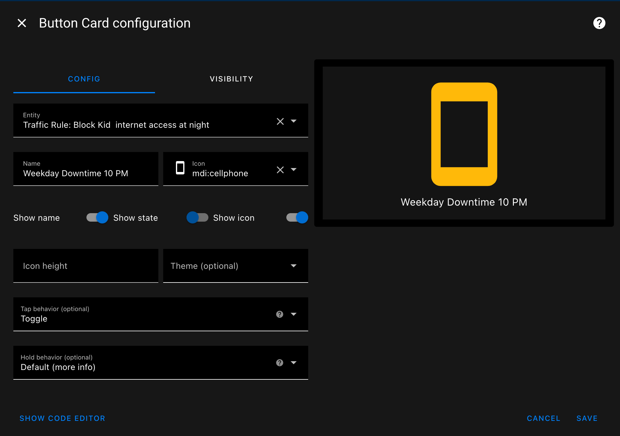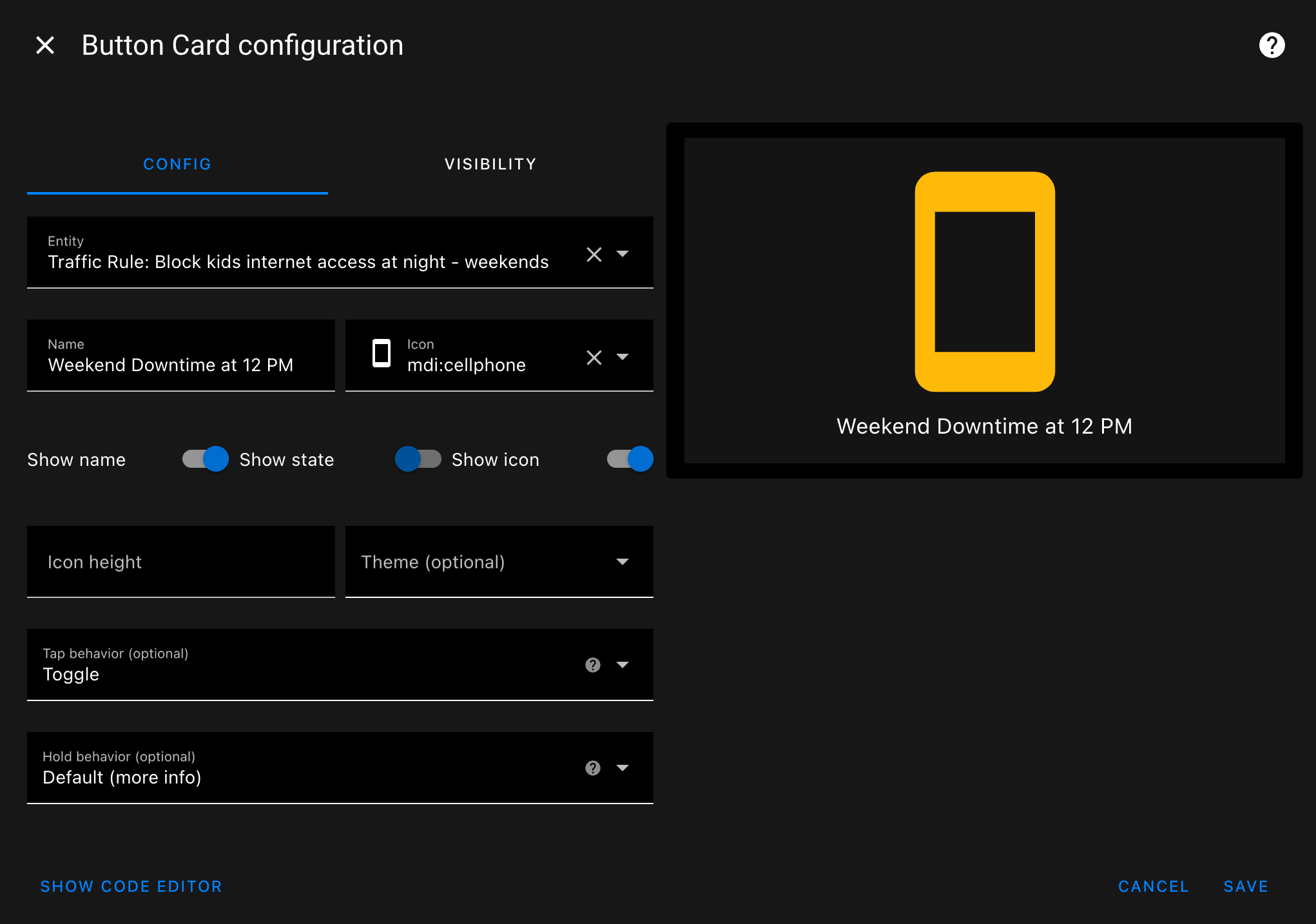 I love using custom dashboards in HA. They're a great way to organize functionality around a room, topic, or set of devices. In this case, I created a new dashboard called Screen Time and will place the Traffic rules I want to toggle as big, giant buttons that are easy to use from your phone.