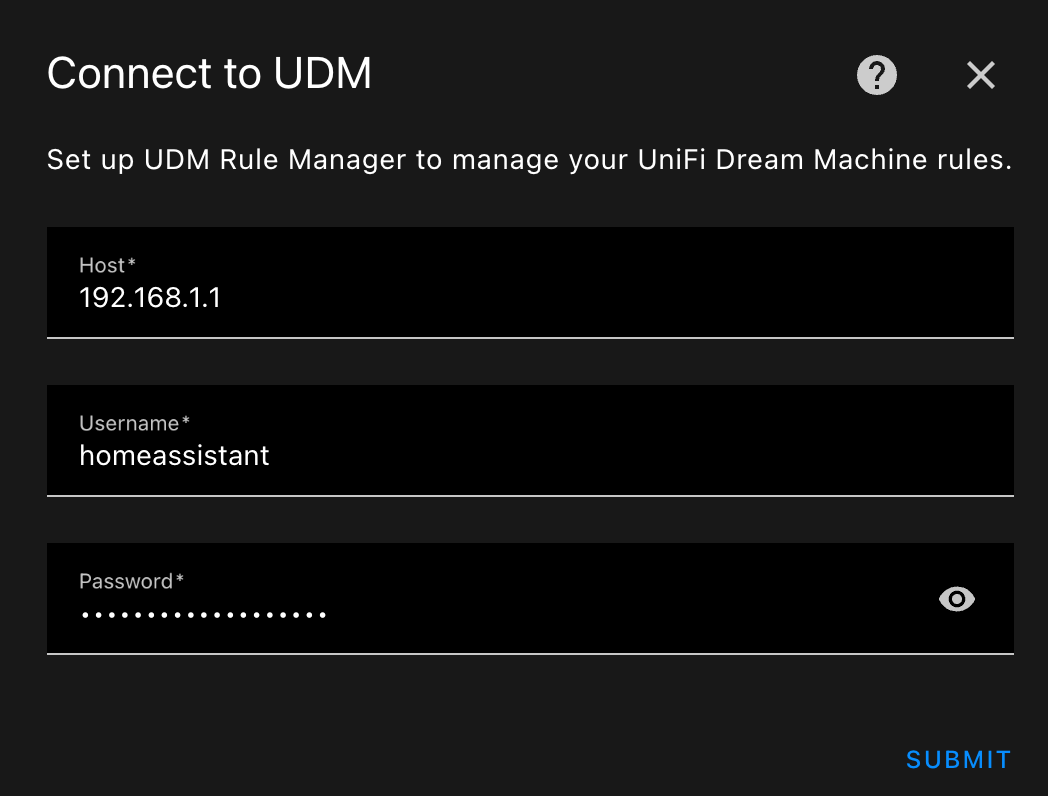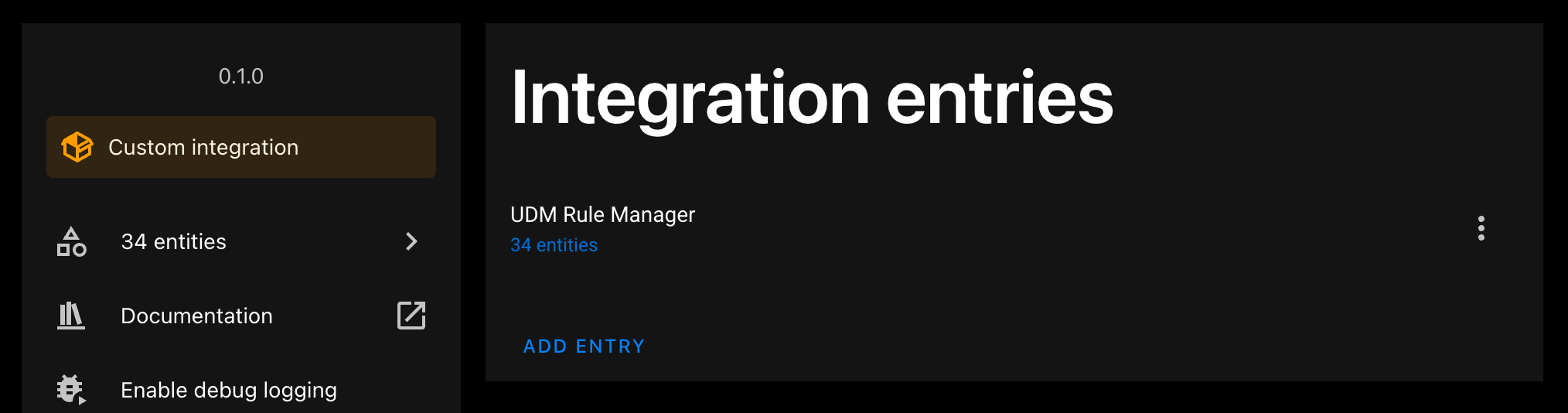 Once installed, go to Devices and Services and Add Integration, select the Unifi Rule Manager, and enter your UDM's IP address, username, and password.