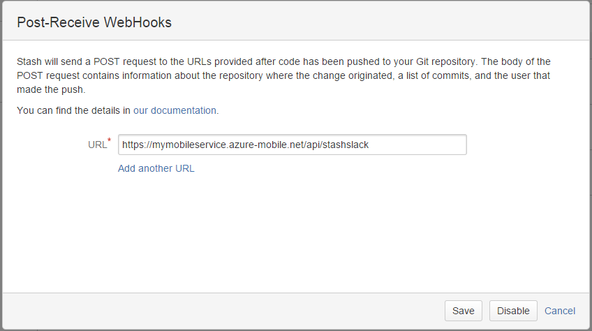In the middle, I'm using an Azure Mobile Services Node.js API. The service I created here receives the events from Stash and then pushes them out to Slack. The best part about using mobile services is that I can create and edit my javascript right in the browser...once I save it, it deploys. Combine that with Postman and Runscope for testing and capturing, and you can quickly get everything developed and configured without leaving your browser. In a previous post, I also discussed using this exact implementation for consuming and relaying kudu deployment notifications.