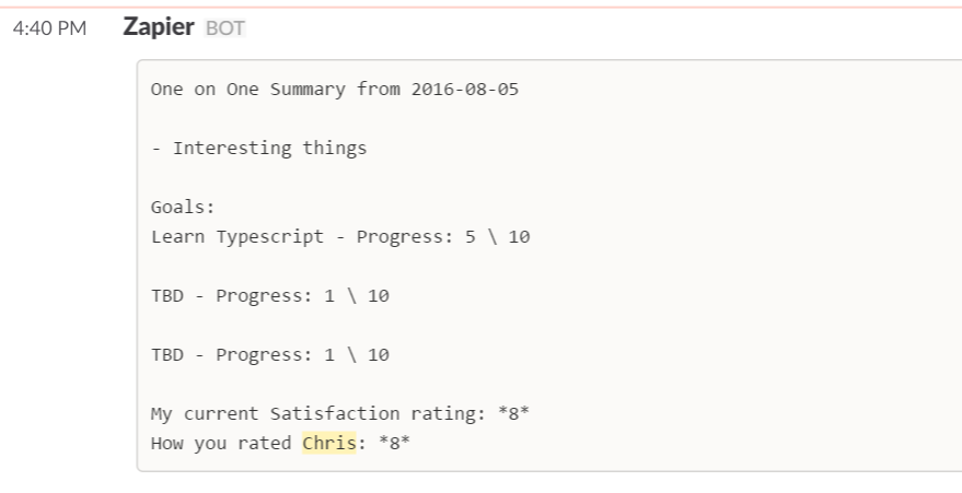 This is where it starts to get fun. Zapier is one of my favorite ways to automate, thanks to its ability to have multi-step workflows. One trigger can be followed by one or more actions, allowing for more complicated automation beyond your typical IFTTT. With each action, you'll be able to utilize each action step's input and output data. Chances are, several things you do manually every day can benefit from some helpful automation via "Zaps." For my purposes, I want to take the data I've collected via Typeform and push that directly into Trello. In that same workflow, I also want to send a Slack DM to the person I met with, giving them the same information. Full 360-degree transparency and fully automated post input! Here is what my Zap looks like broken down by step: