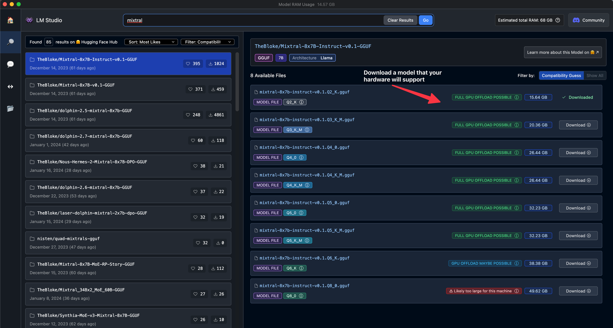 You need some heavy metal to run this locally. Any modern computer should work, but for this method to shine, you're talking about an M2/3 Max/Ultra with higher specs or a Windows PC with a modern CPU, lots of RAM, and an RTX30/40 series GPU (with lots of Vram). I'm running a fully loaded M2 Max MBP to safely utilize over 50 gigs of RAM (M2 SoC uses shared memory with GPU), plus Metal support, producing some nice results. Thankfully, many ram/vram-friendly options exist, even with some of the latest models. LM Studio does a nice job estimating what your rig can run as you browse and download models. Generally, the larger the model file and resource requirements, the higher the output fidelity. I wouldn't push it to the max, but push it up if you can.