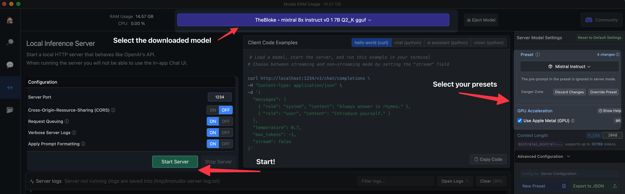 This is as simple as selecting one of your downloaded models and hitting the Start Server button. The default options should work well, but tweak them to your liking.