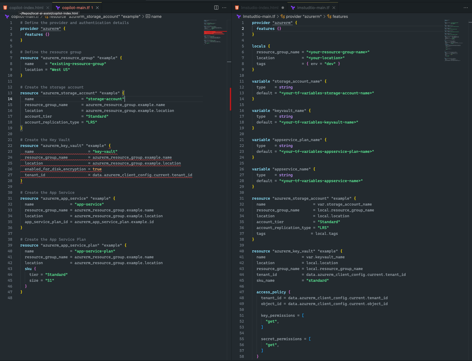 I give a slight edge to LM Studio and Mixtral here, as the Terraform is not only more complete, but it's also lacking syntax errors. Granted, CoPilot has one small error in which the key vault declaration is missing the sku_name, which is easily corrected.