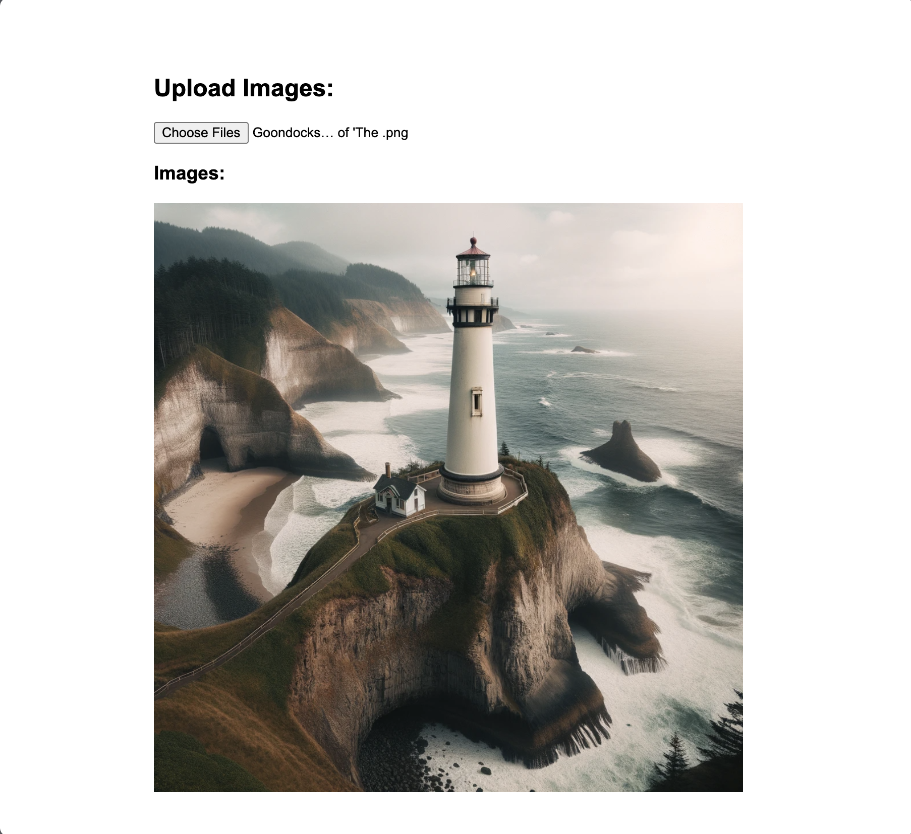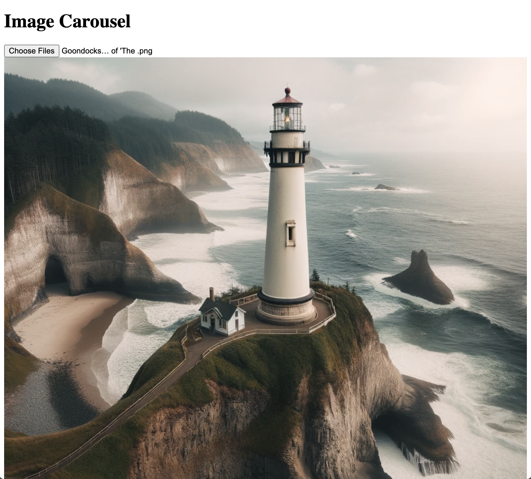 write a single html file that allows you to upload images, then display all of the images in a carousel. use only web technologies that can run in the browser