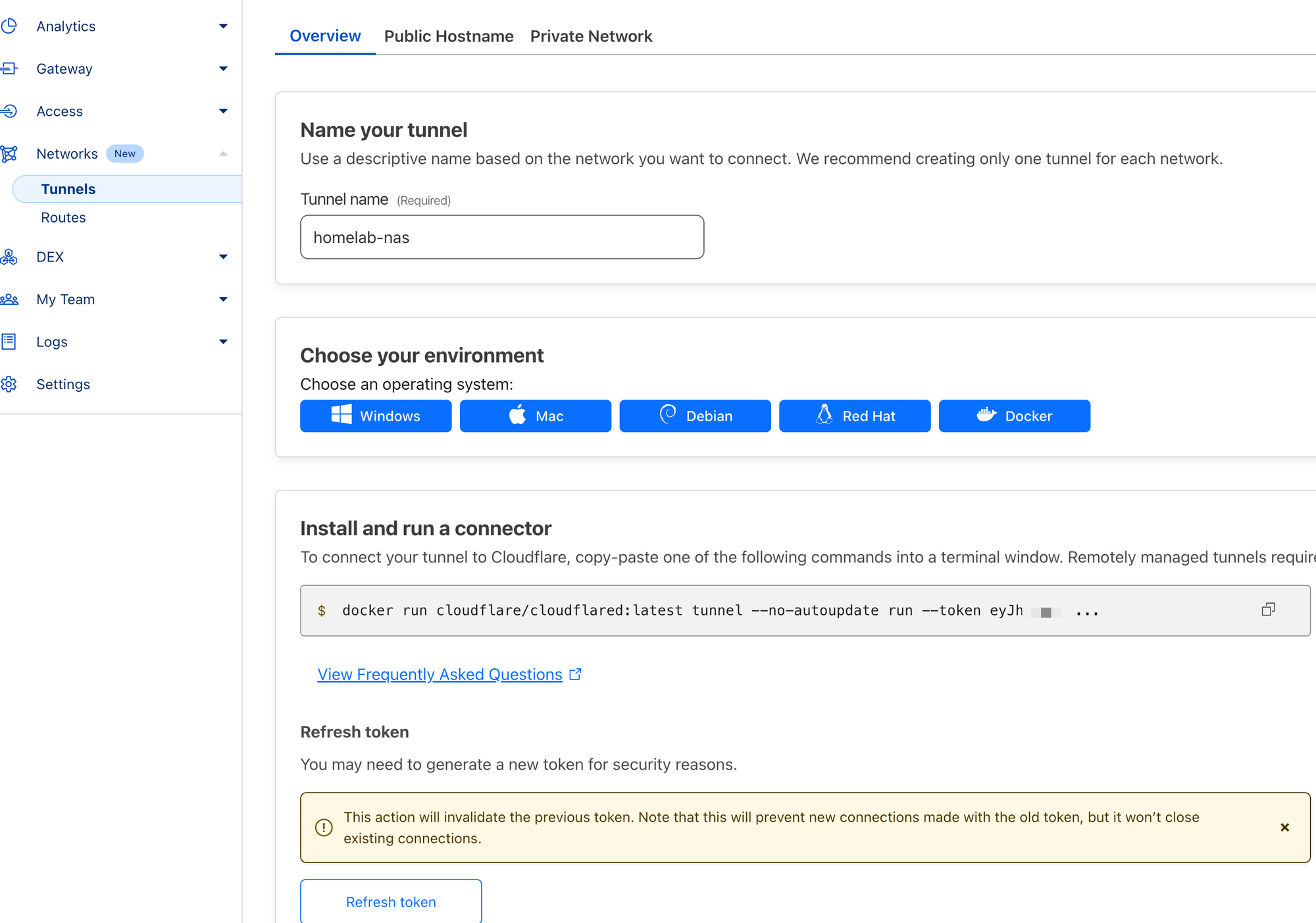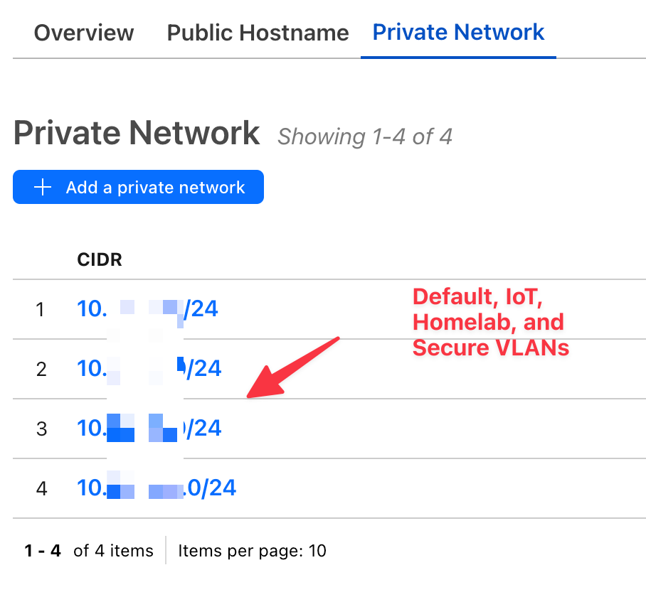 Maybe your k3s cluster is down, or maybe you're doing some maintenance, but why not have a few extra tunnels running just in case? Running lightweight containers on your always on NAS is a simple way to add some additional piece of mind. Create a new tunnel in your ZeroTrust dashboard Network -> Tunnels. Once created, you can create as many instances of the tunnel as you want to. For this tunnel, I'm setting up several of my local VLAN routes, to ensure I always have remote, VPN style, access to my network with the Warp client. If my k3s tunnels fail, and I lose public app access, I'll still have local network access through this set of tunnels running on separate metal.