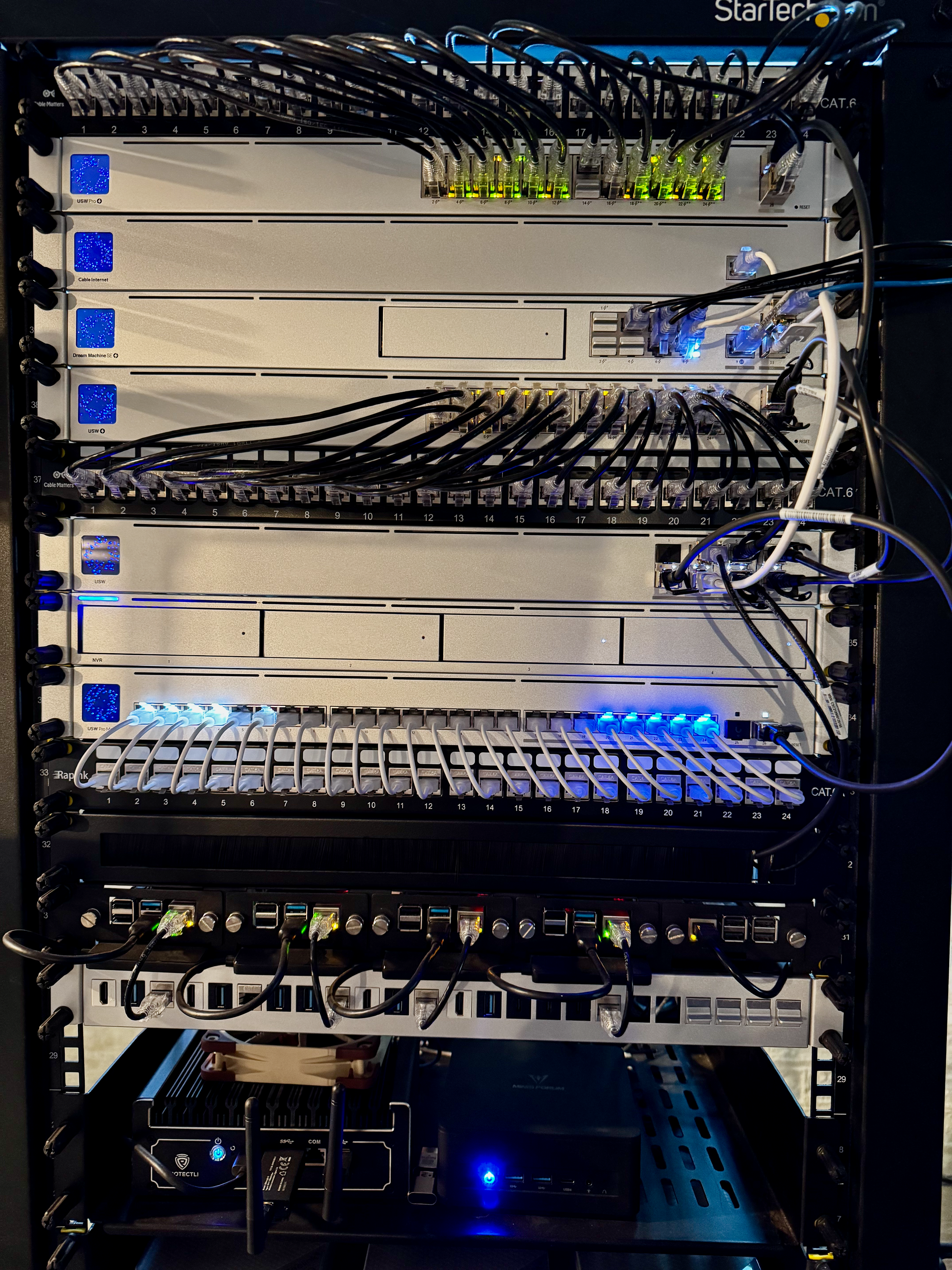 - Rack switching. There are so many things to consider here. I have a mix of 2.5GB, 1GB, 1GB PoE++, and 10GB network devices, spread across many floors, inside and outside. I started with a single PoE Pro series switch, which is still in use, and am currently expanding to the Pro Max switches with etherlighting. Given the investment, I would size up a bit if you can spend the money.