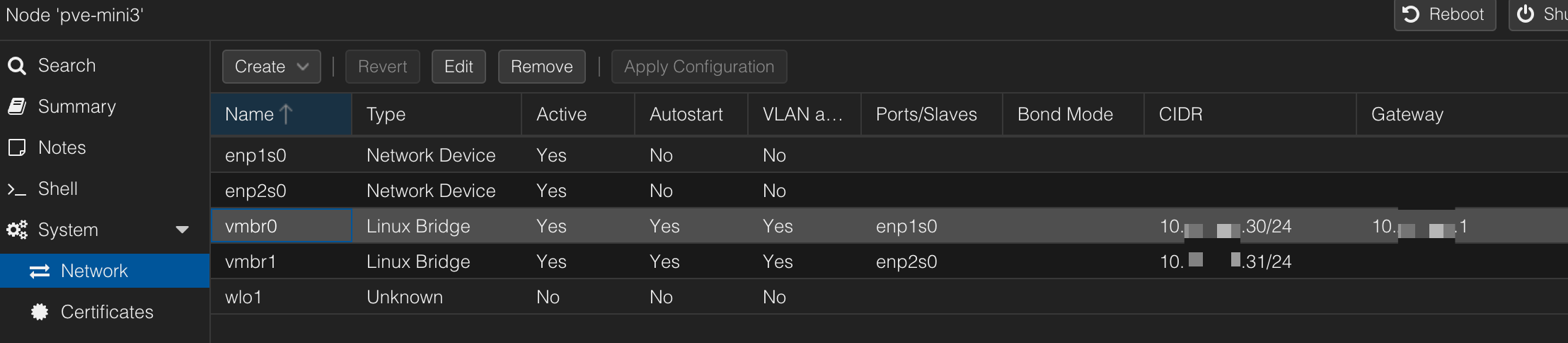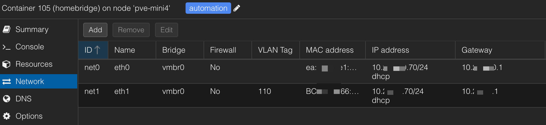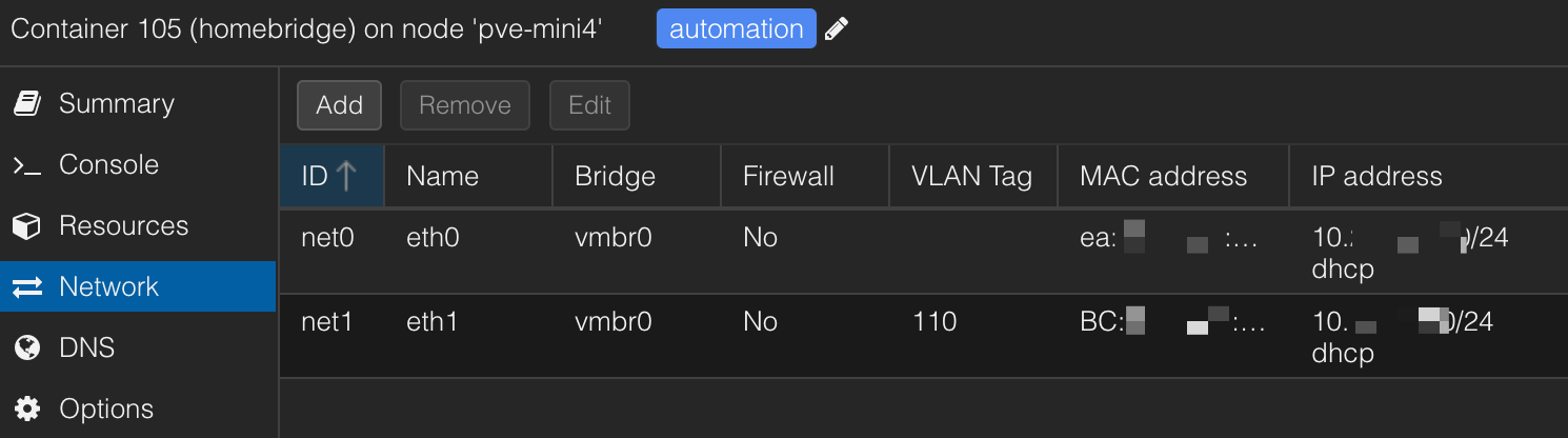 One of my favorite features of Proxmox is the software-defined network. In these screenshots, you can see that I have two bridge networks defined on the host bound to the physical network devices: vmbr0 (bridge) to enp1s0 (nic) and vmbr1 to enp2s0 and I've given the bridge a static IP on the homelab network. Now see my homebridge container, which has two virtual network interfaces, one on the default VLAN (homelab) and one on a separate VLAN (110 aka IoT). Both interfaces use the vmbr0 bridge, which is assigned to only one physical nic. This allows homebridge to easily discover devices within the IoT network while existing and being managed on the homelab network over a single physical device. I use a similar configuration for Home Assistant. Overall, it is more flexible than using port profiles and attempting this same configuration on my managed switches. Sometimes, what should work doesn't, so this is a clean way to cut through that. I find it best to keep the configuration close to the implementation.