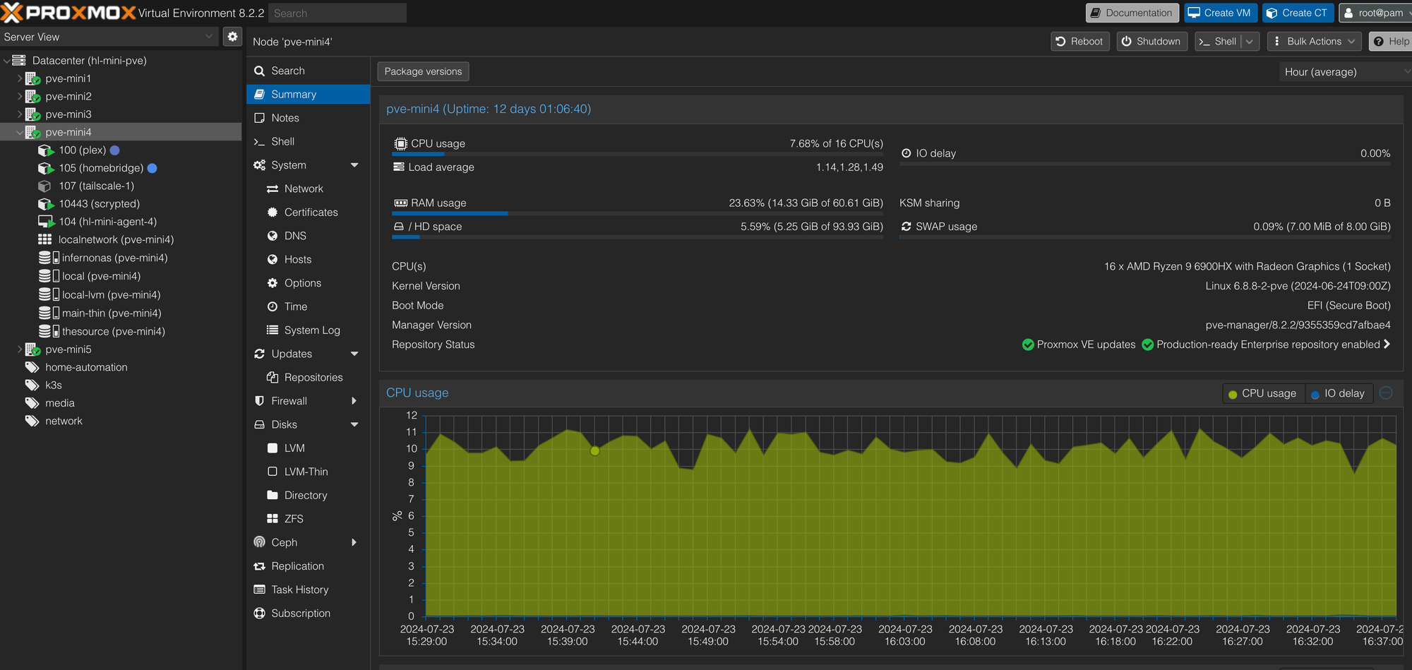 Other than the Pis, if it's running in my homelab, then it's running on Proxmox VE. Proxmox not only makes hardware management easy through its easy-to-use UI and terminal but also supports clustering and high availability out of the box. I won't list all the features here; know it's free to use, supports near-native performance VMs and Linux containers, and runs on almost anything. There is an excellent support community, which I contribute to, and has helped me out more than a few times. I've used Proxmox VE for many years, and I expect many more years to come...don't homelab without it.