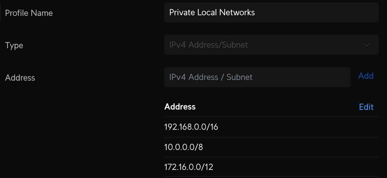 Create a new IP Group Profile called Private Local Networks network/default/settings/profiles/port-ip-groups and add the following: