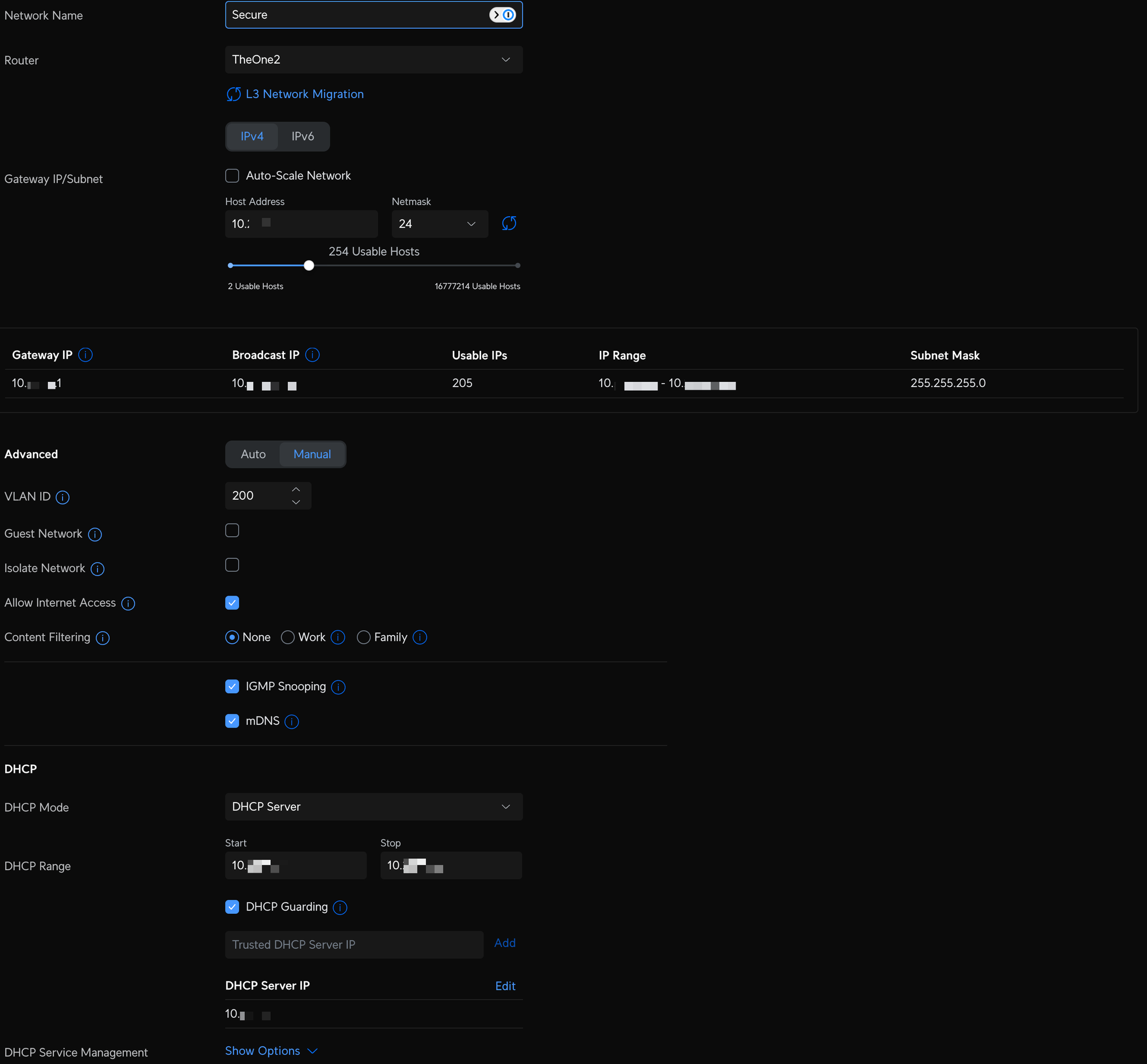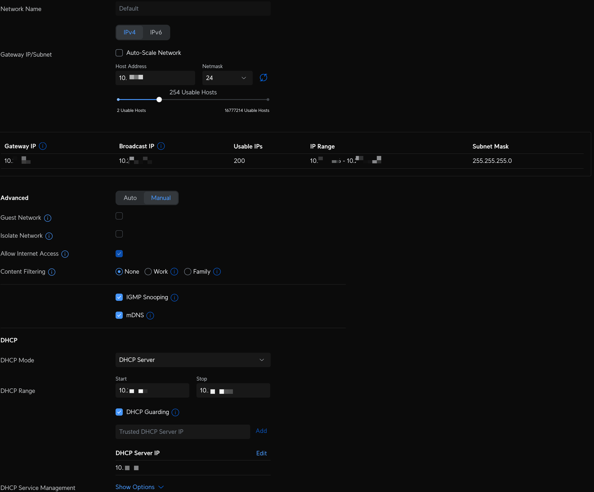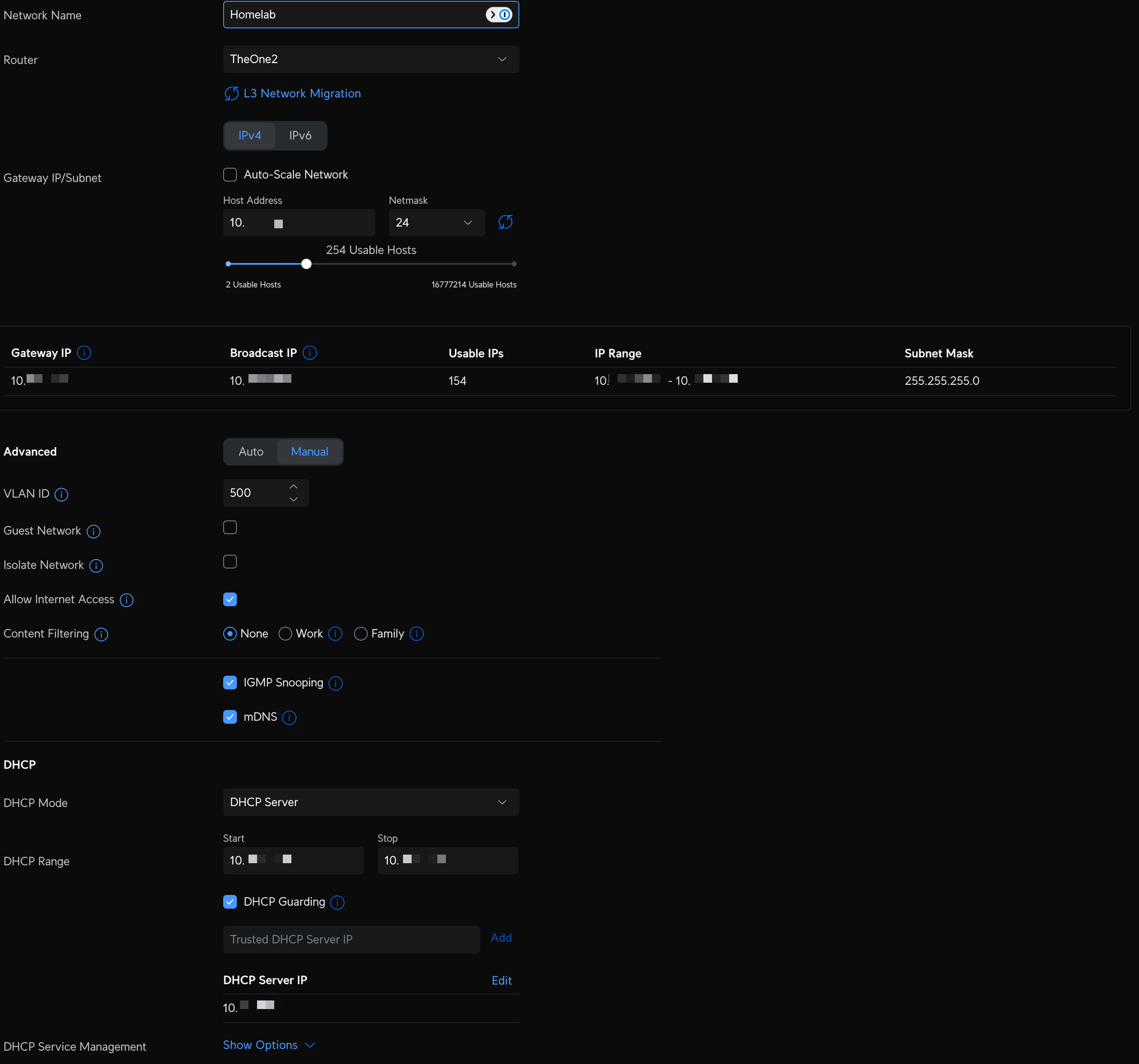 - Homelab - a network dedicated to hardware and services that I host within my homelab. Devices on this network have full access to the internet and can talk to other networks. I created this primarily to get a dedicated pool of IP addresses, so I have plenty of room to expand. I'm slightly less concerned about isolation between this and my default and IoT network. For example, Home Assistant lives on Homelab and interacts with select devices in IoT and Default, and that's what I need it to do. No WiFI SSID is associated with this network, as everything is connected via Cat-6.