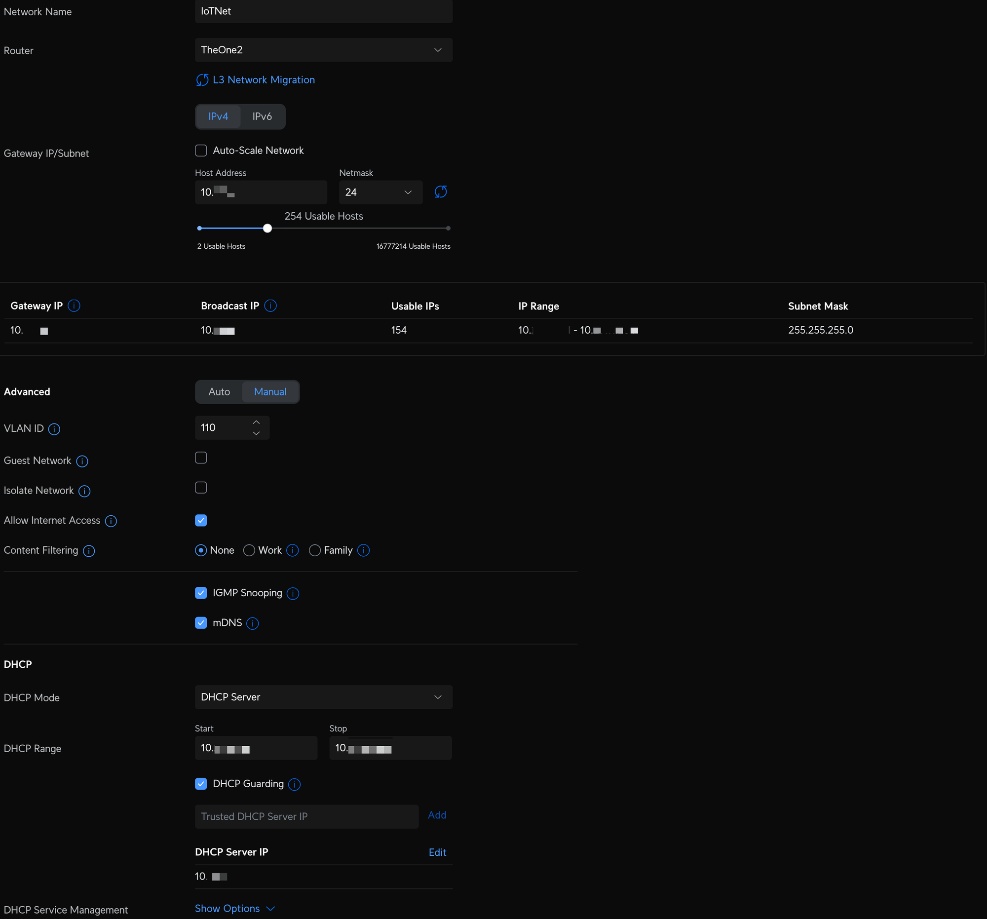- IoT - my first VLAN created for all "smart" devices on my network that require internet access and are not personal devices. Devices on this network are not permitted to communicate with any device on the Default network, but are allowed to communicate with other devices on the IoT network. This also has a dedicated SSID, so anything joining that WiFI SSID will be on the IoT network.