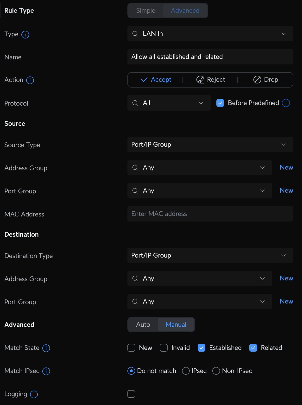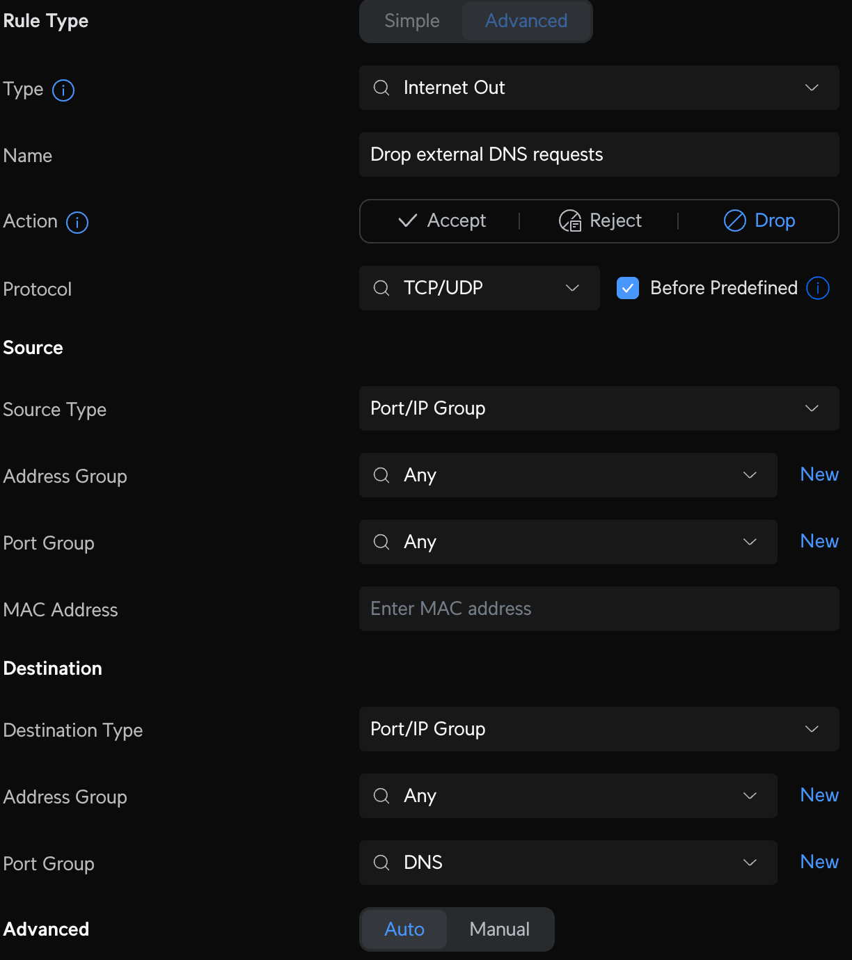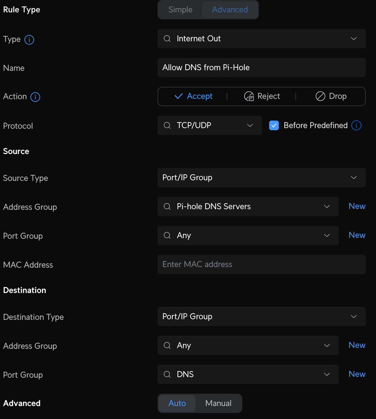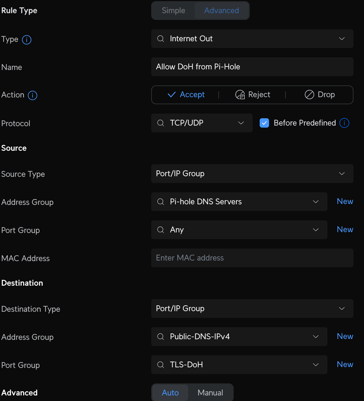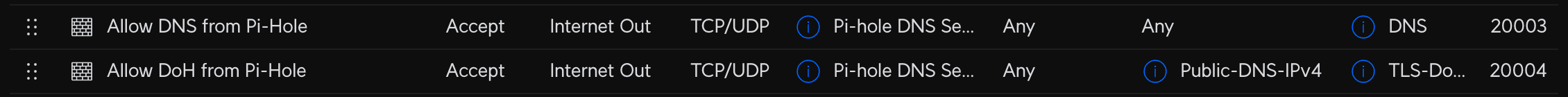 Now create some new Internet firewall rules that will allow us to access public DoH servers from our Pi-Holes and not anywhere else. Create two new Internet Out rules to Accept all DNS traffic from Pi-Hole servers and two new Internet Out rules that Drop all other DNS traffic from non-Pi-Hole servers. The Accept rules should be above the Drop rules; order matters.