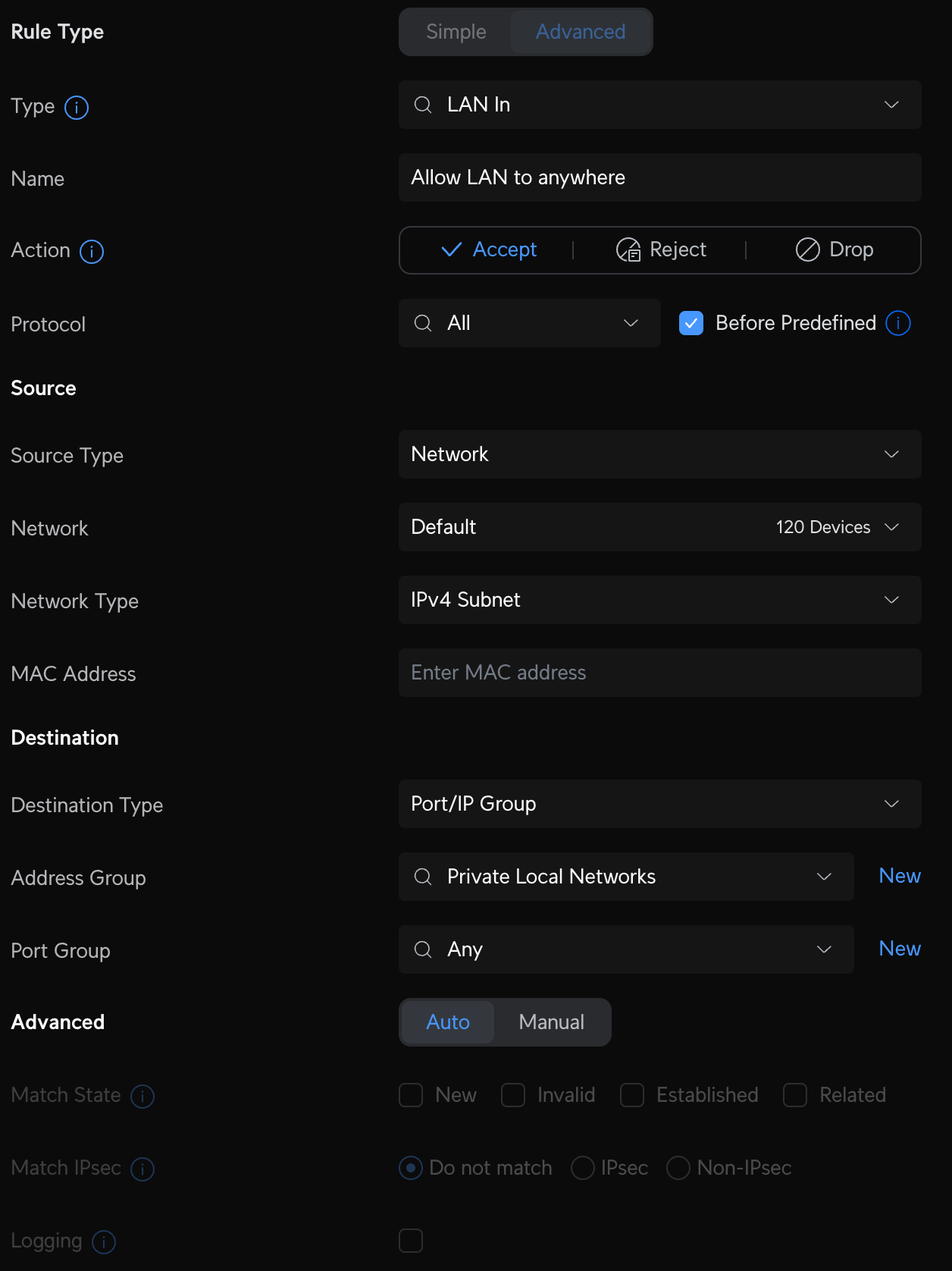 Create a new LAN in firewall rule called Allow LAN to anywhere. This rule allows devices on the Default network to communicate with devices on any VLAN.