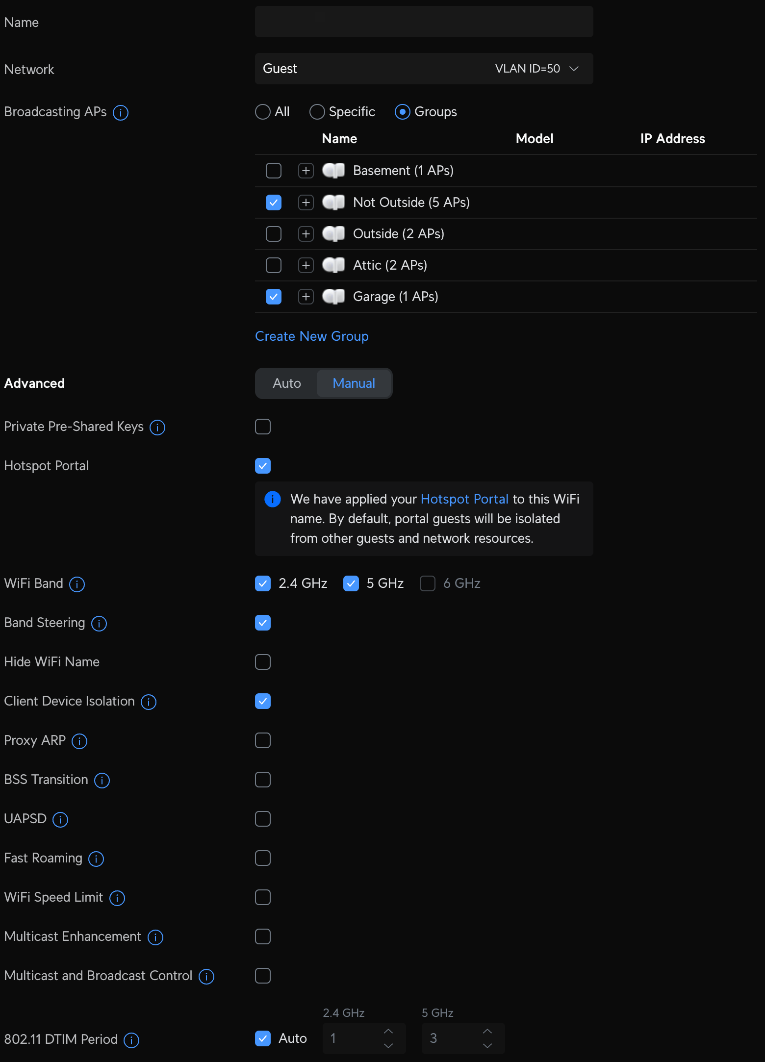 - Guest - a network dedicated for people who need temporary access, like house guests, friends, etc. Devices on this network can access the internet, cannot access any other networks, and can not access or see any other device on the guest network (device isolation). A dedicated and unencrypted WiFI SSID controls access to this network with a hotspot landing page, where you enter a password and accept terms, similar to a coffee shop or a hotel. After 24 hours access is automatically removed.