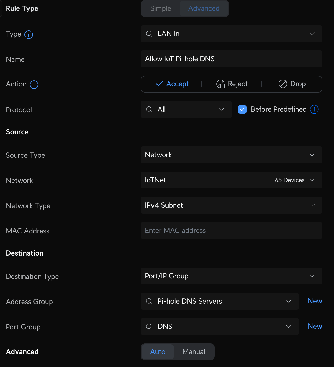 Make sure your devices on other VLANs can reach your Pi-Hole servers. First create a Profile IP Group Pi-Hole DNS Servers and enter the IP addresses of each server. Then create two additional Port Groups: one to define the DNS Ports called DNS, and one to define DNS DoH ports called TLS-DoH (you'll use this later). Finally, create the LAN In rule to allow devices on your VLAN to access Pi-Hole DNS on any other VLAN called Allow IoT Pi-Hole DNS.