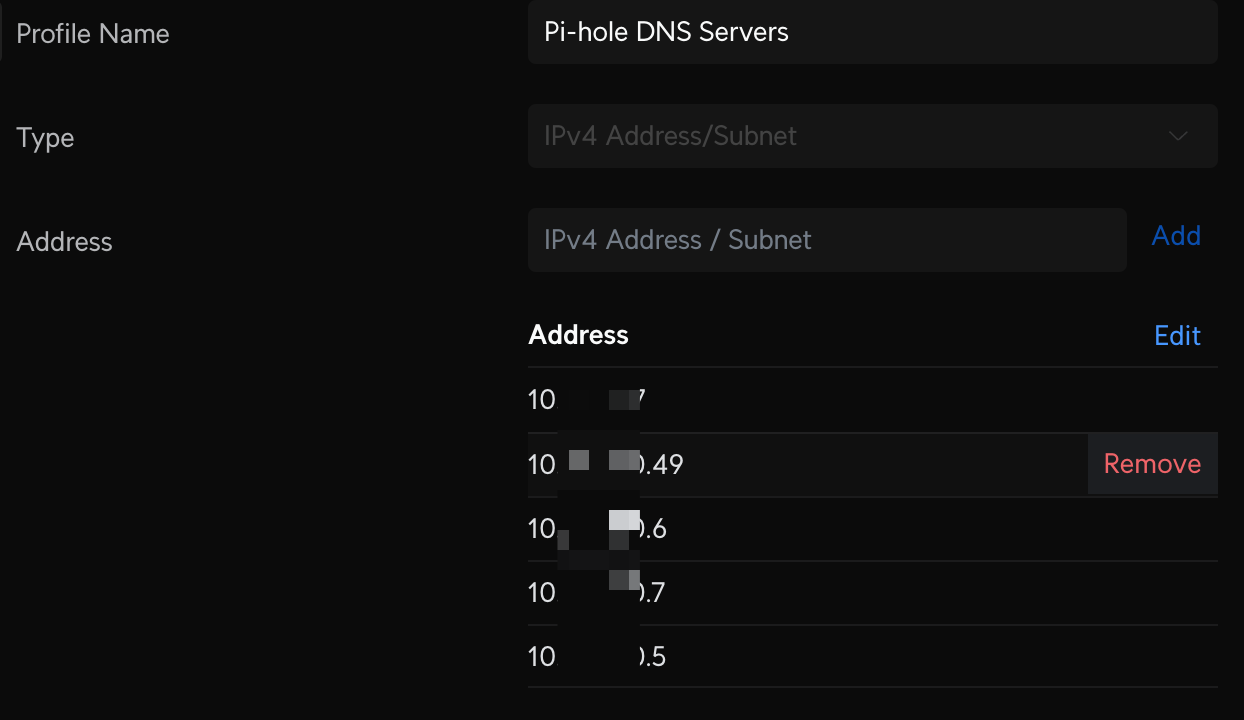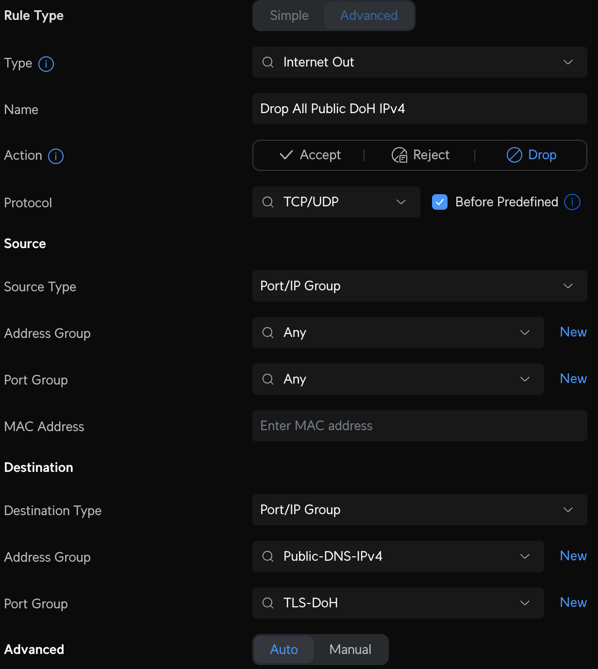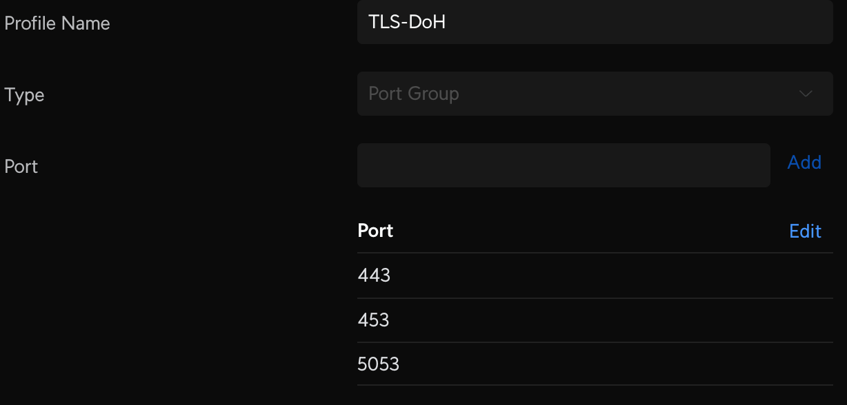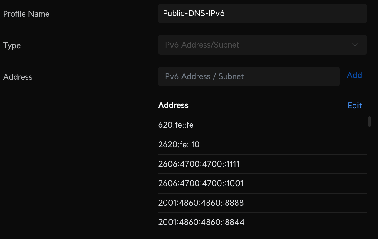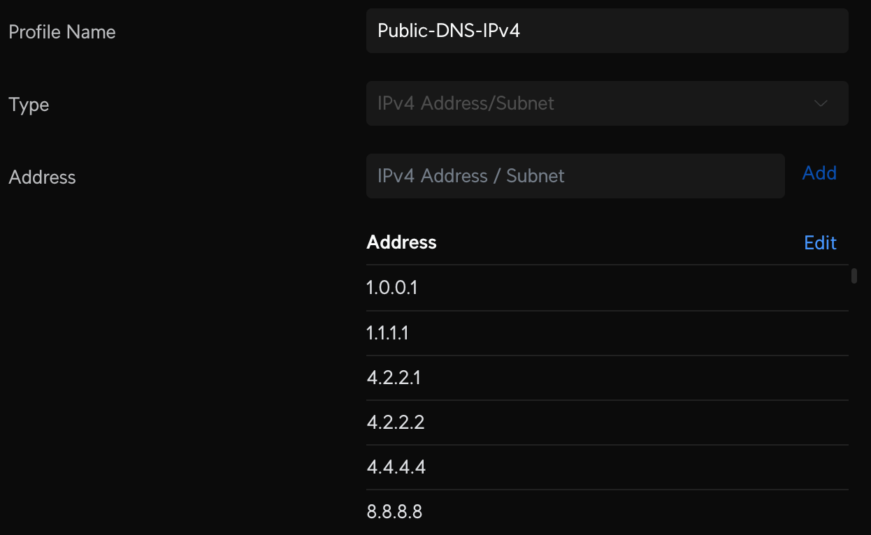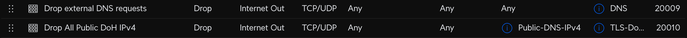Create two new Profile IP Groups containing the list of public DNS DoH providers, Public-DNS-IPv4 and Public-DNS-IPv6. I've created a Gist below to help get you started. This will cover the main public providers, and I provide a few links in the comments of the Gist for lesser-known providers you may want to add for good measure. For reference, I have about 200 IP4 and 55 IP6 addresses in my lists and counting.