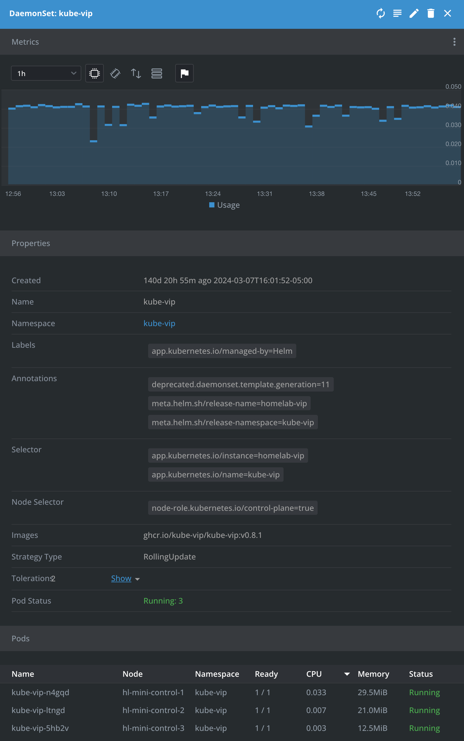 - kube-vip - Adds high availability to your cluster through a virtual IP (VIP) and control-plane and service load balancing. Use their Helm chart to deploy or via kubectl to apply directly.