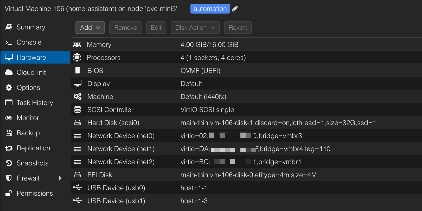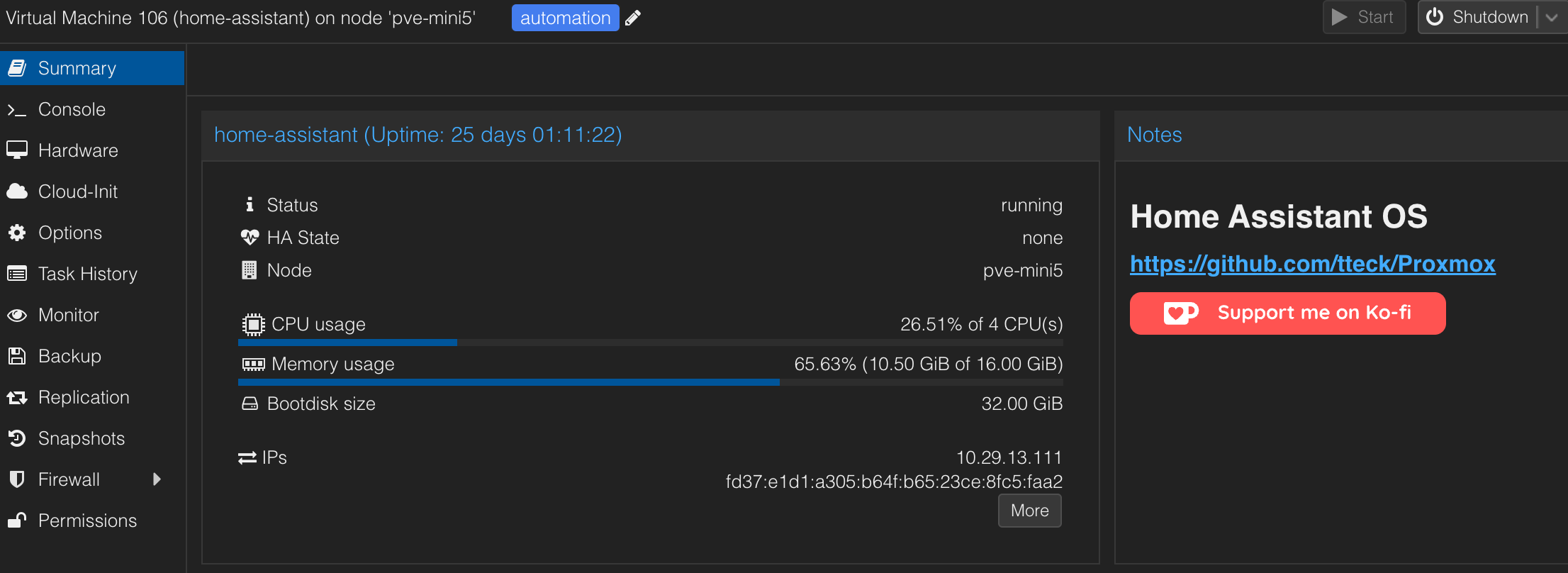 The ultimate automation services for everything in your smart home. I integrate my home solar and storage, all of my lighting, locks, Unifi network and camera, and even some custom integrations I created myself. The community for HA is awesome, which will make getting started very easy. I recommend installing via one of the Proxmox scripts here. I'm currently using the VM script, which I find the most flexible as I need to pass through several physical USB devices, like Zigbee, Z-Wave, and Bluetooth antennas. I would recommend a good amount of CPU cores and a healthy amount of RAM if you are a heavy user like me. You'll also notice that I have several network adapters, to help with device discovery on separate VLANs.