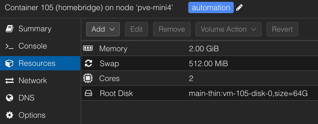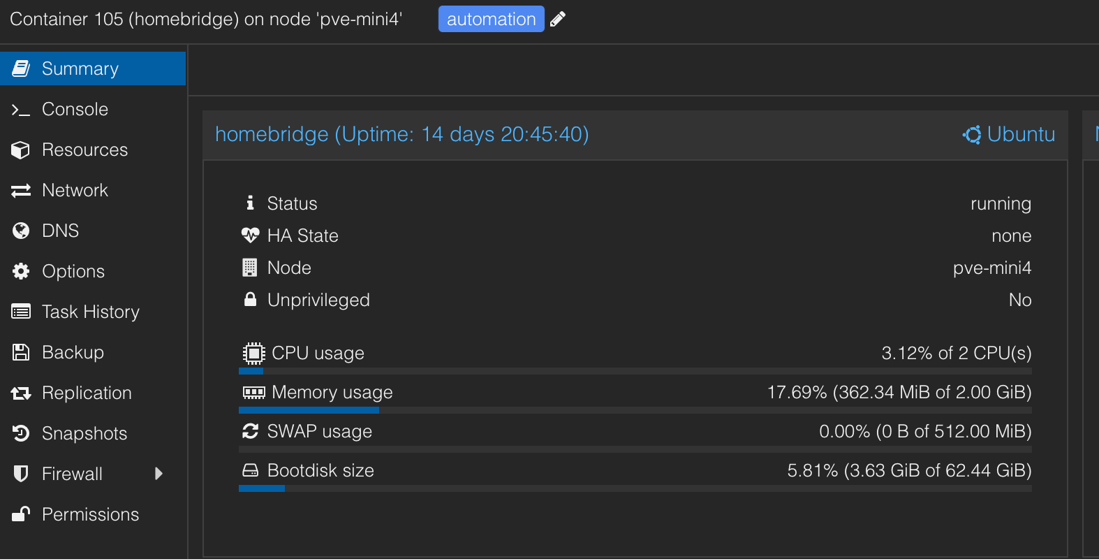 If you are a HomePod/Homekit family, then Homebridge is a must-have addition to your homelab. Homebridge acts as an unofficial bridge that can be added as a device to your Apple Home ecosystem and allows you to bring smart devices that are not officially supported to Homekit. This allows me to reliably control Switchbot, Elgato lights, LG TV, and a few others. It is very well suited to host on a lightweight Proxmox LXC container. Here are some snapshots of my Proxmox config, homebridge dashboard, and the Apple Home app on my phone showing the integration.