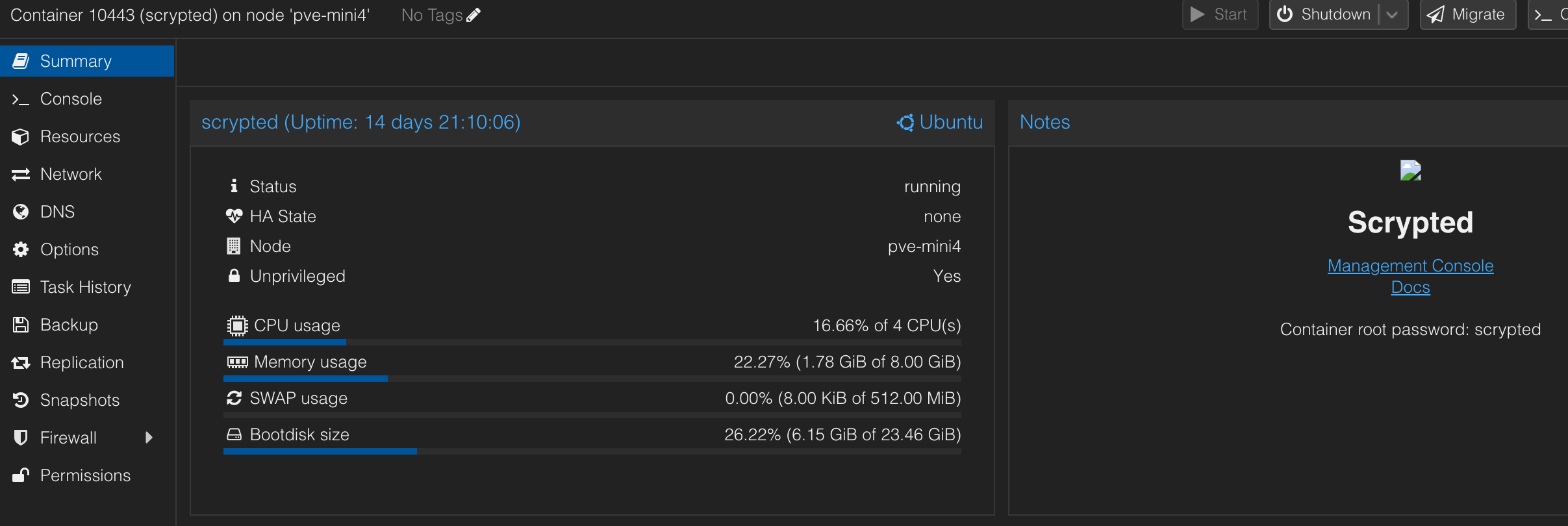 Hosting with a Proxmox container is the recommended way to run Scrypted, and they provide an install script that will also enable hardware encoding support for your camera streams. This one runs on my MINISFORUM mini PC, with dedicated graphics and it works very well. This will consume a decent amount of CPU, so make sure you run this on something that can handle it.