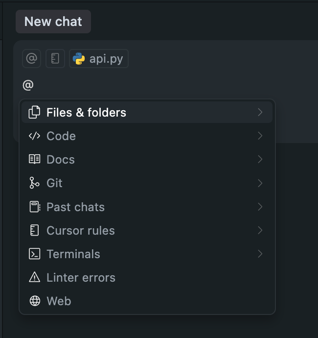 Just like rules and prompt files can be used to establish general context, it's vital that you consistently provide relevant context to the agent to get thorough results. Well-written code is complex and uses abstractions, libraries, APIs, and unit tests. A single feature will likely cross dozens of code files. Unless you provide those files, assume it has no clue. Thankfully, VS Code and Cursor make this incredibly easy and are actively improving the tooling for this. Within the agent chat window on the right, you can ➕ files and use syntax like @ or # to include entire folders, individual files, previous chats, and even websites. Do it every time. Missing key context will almost certainly lead to incorrect, incomplete, or duplicate code.
