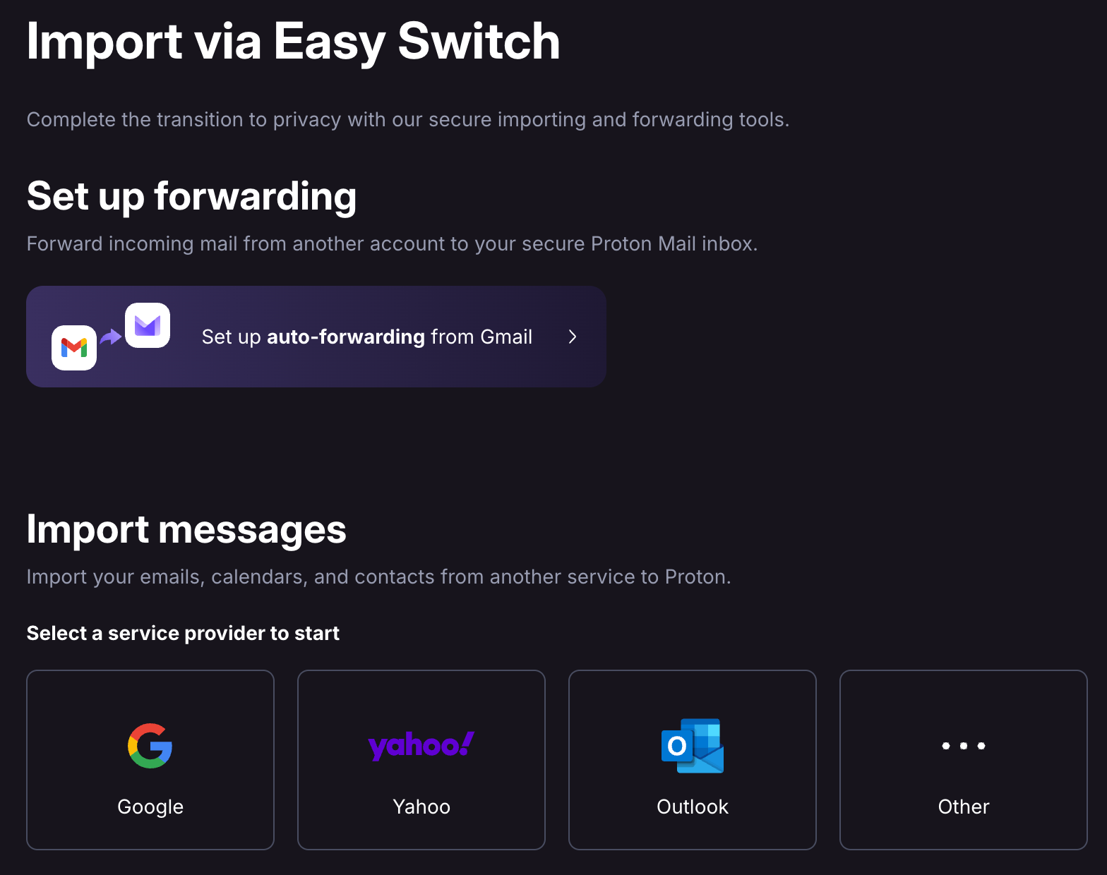 ✅ Import all existing messages from your current email provider. Proton's Easy Switch feature makes this easy. Go to your settings in Proton and select import via Easy Switch. Then follow the instructions. Once imported, you can safely delete them from your old provider.
